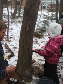 On Friday, March 8, Doug Brown from Slopeside Syrup visited our class. He showed us pictures of his sugar house, tubing, and maple syrup. Mr. Brown brought in some of his equipment and explained how he uses it. We all went outside and learned how to identify a maple tree by the leaves and branches. We particularly enjoyed helping to tap four trees in the woods behind our school. Our class will be collecting sap and Mr. Brown will boil it down into maple syrup for us.